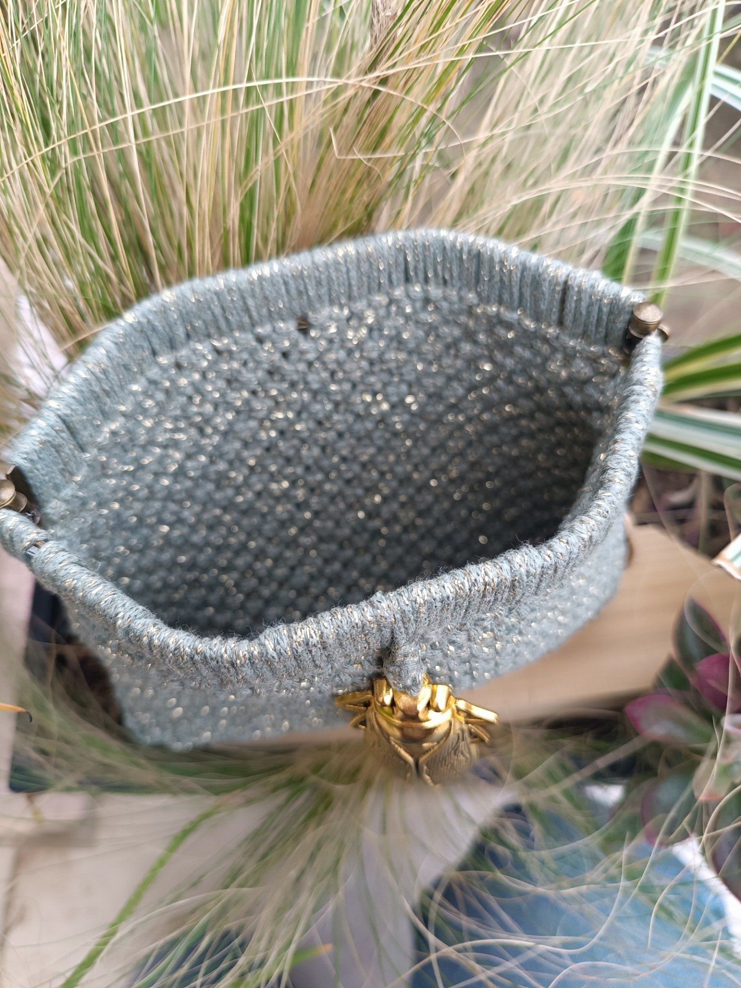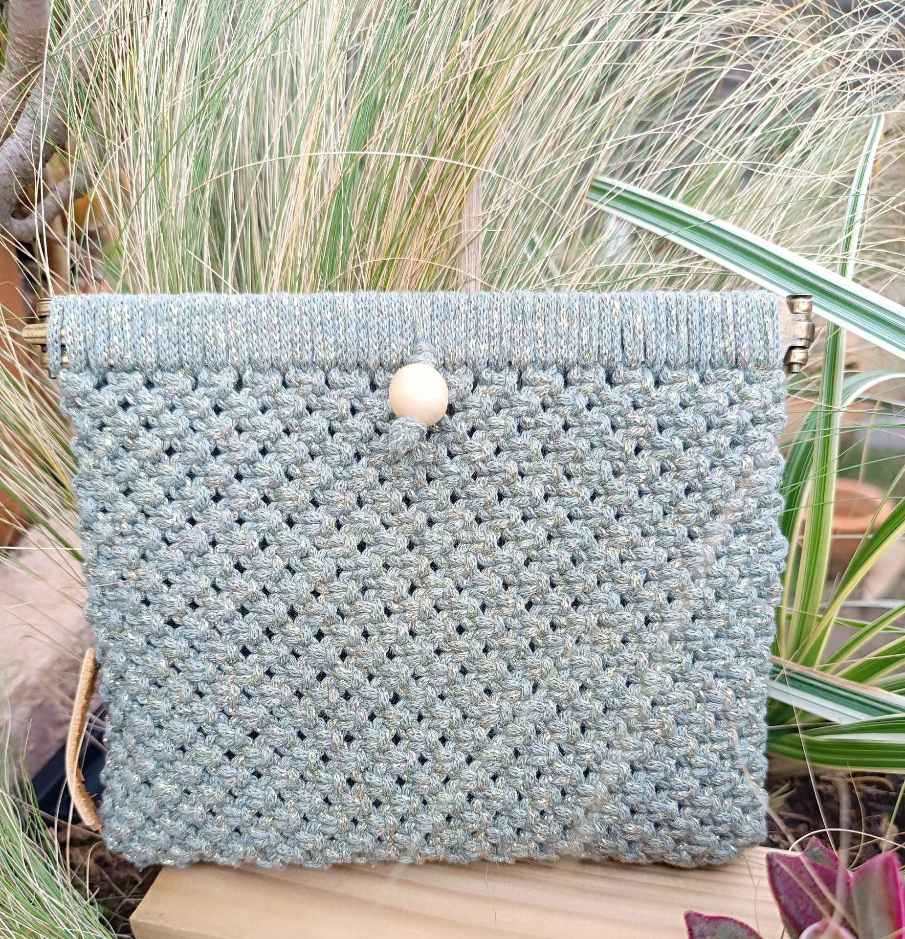 Élégante et pleine de caractère, cette grande pochette en macramé est entièrement réalisée à la main dans un fil de coton rehaussé d’un délicat fil doré.