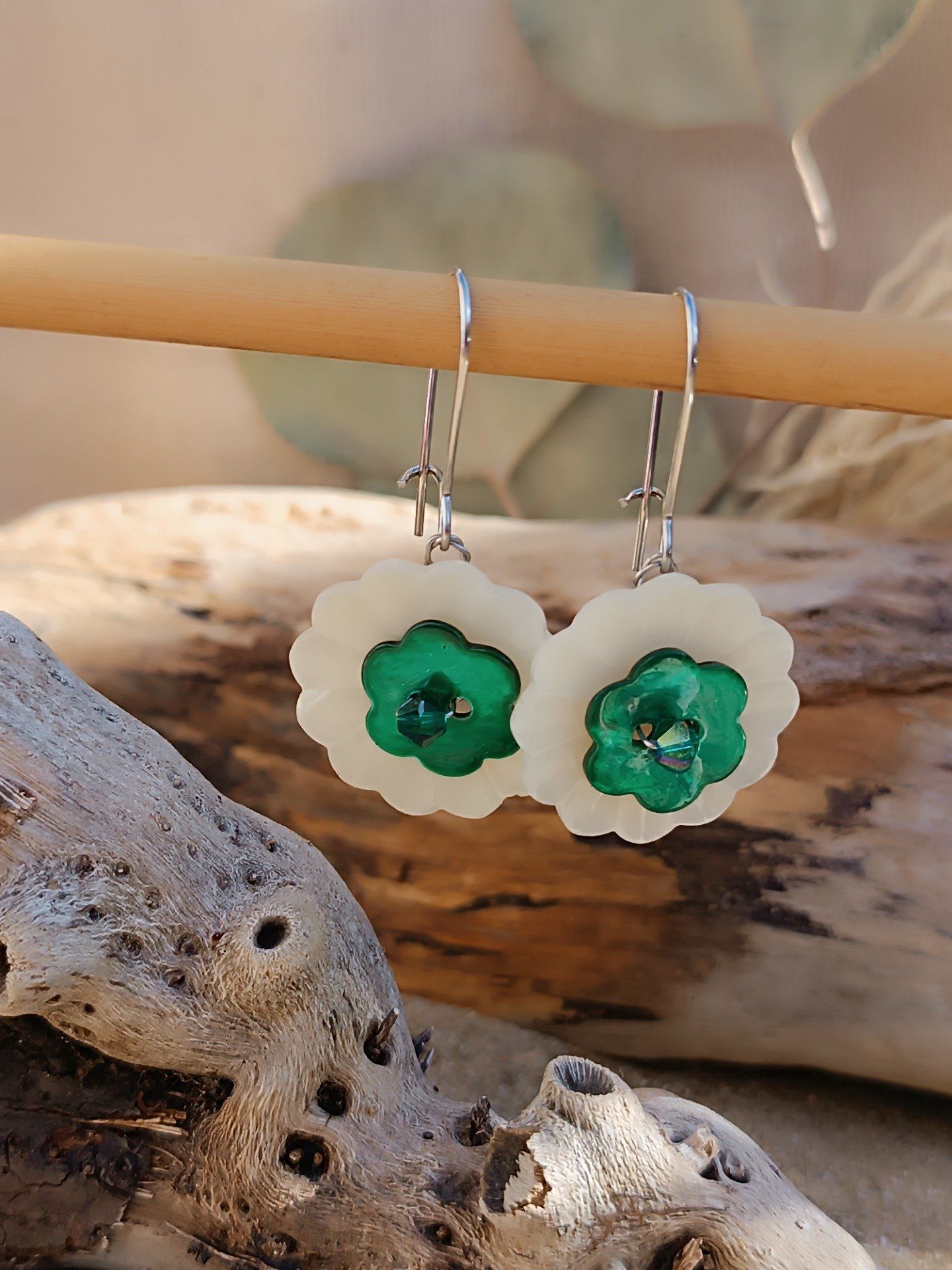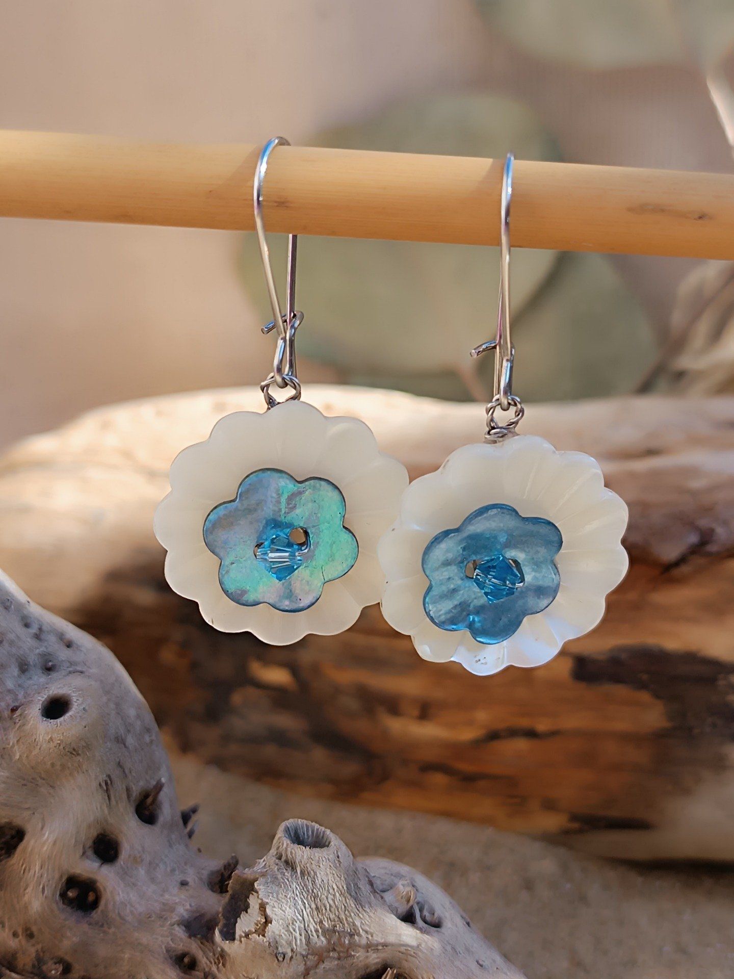 Des boucles d’oreilles réalisées à partir de petits boutons en nacre anciens. ( boutons blanc/beige)