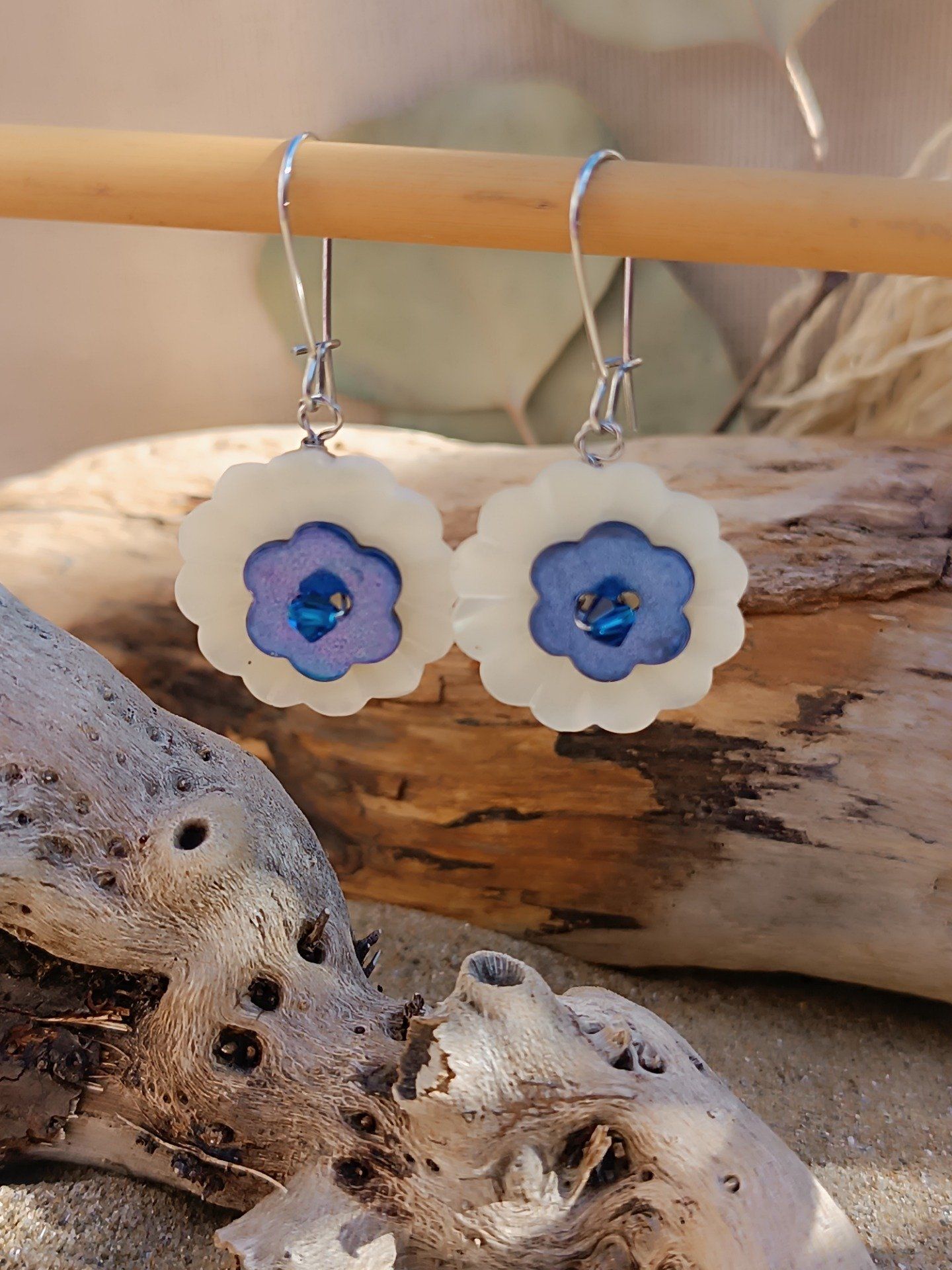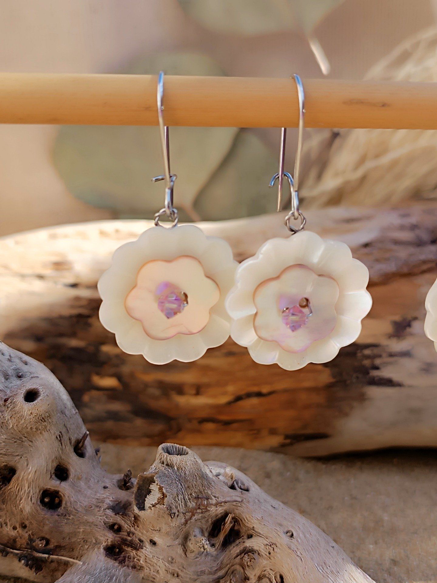 Bouton de nacre beige, réhaussé d'un autre petit bouton en nacre coloré en forme de fleur, et un cristal de Swaroski vient donner de l'écat en son centre.