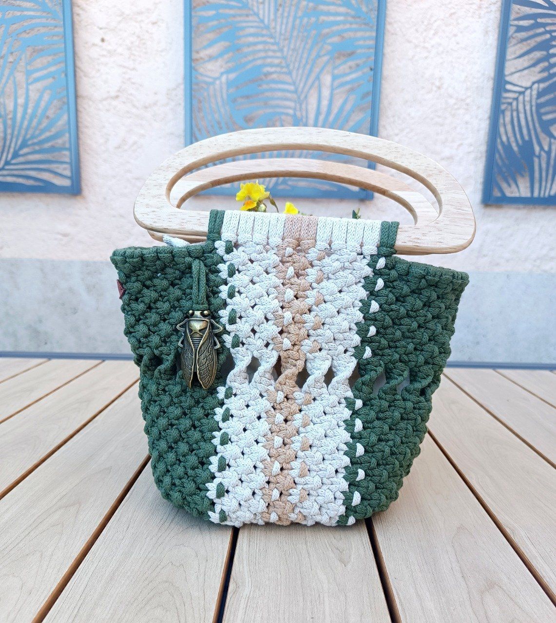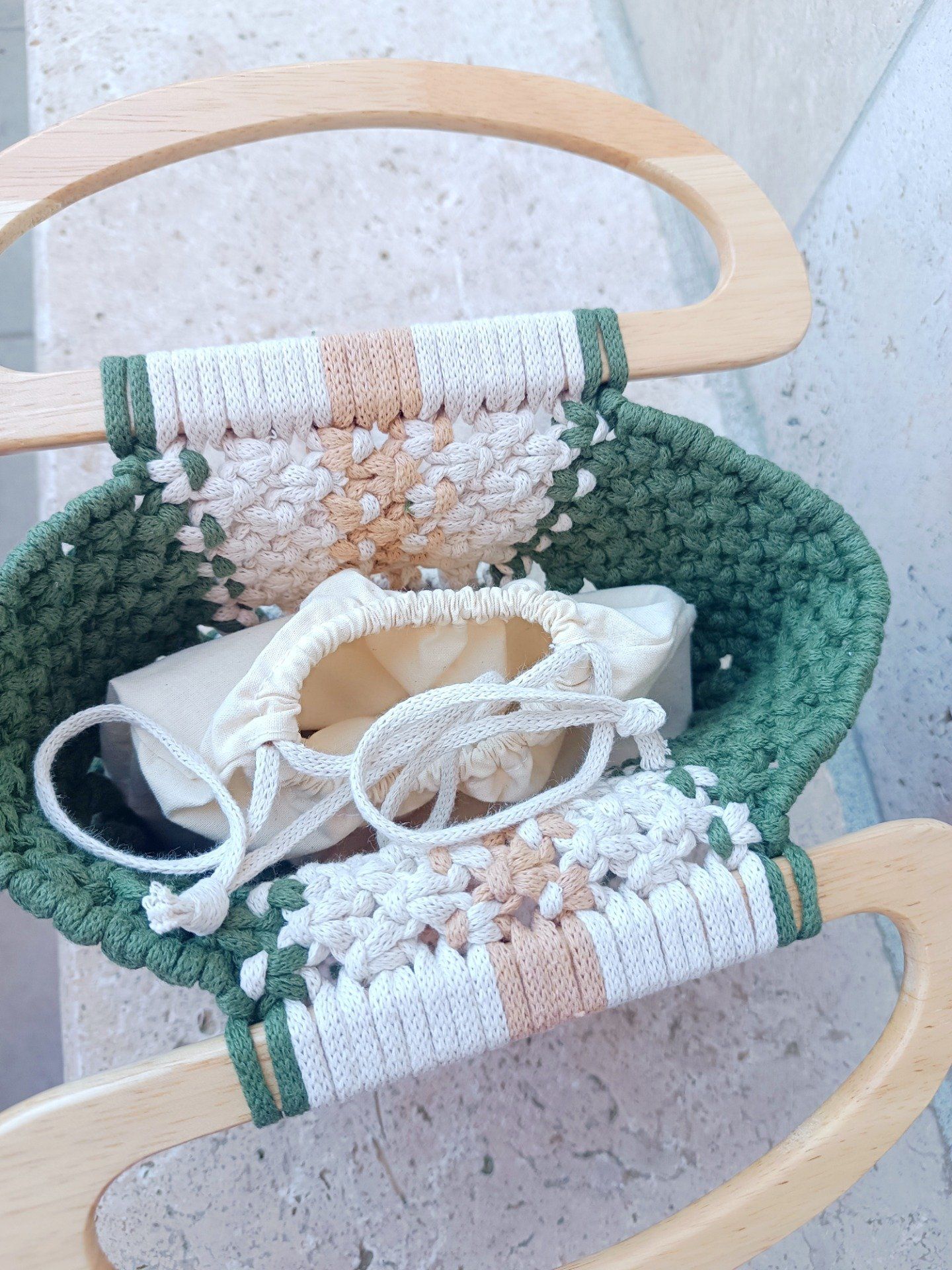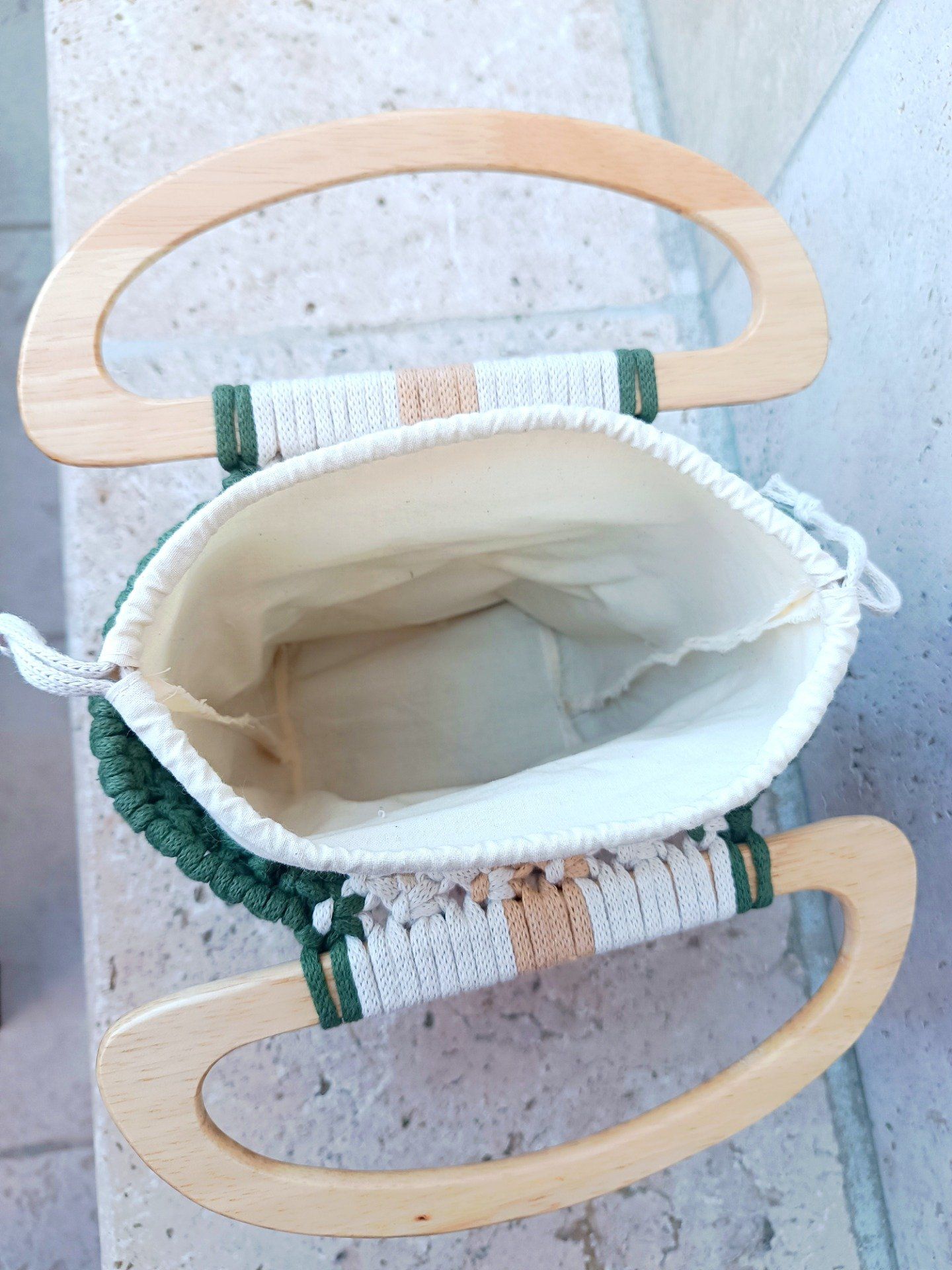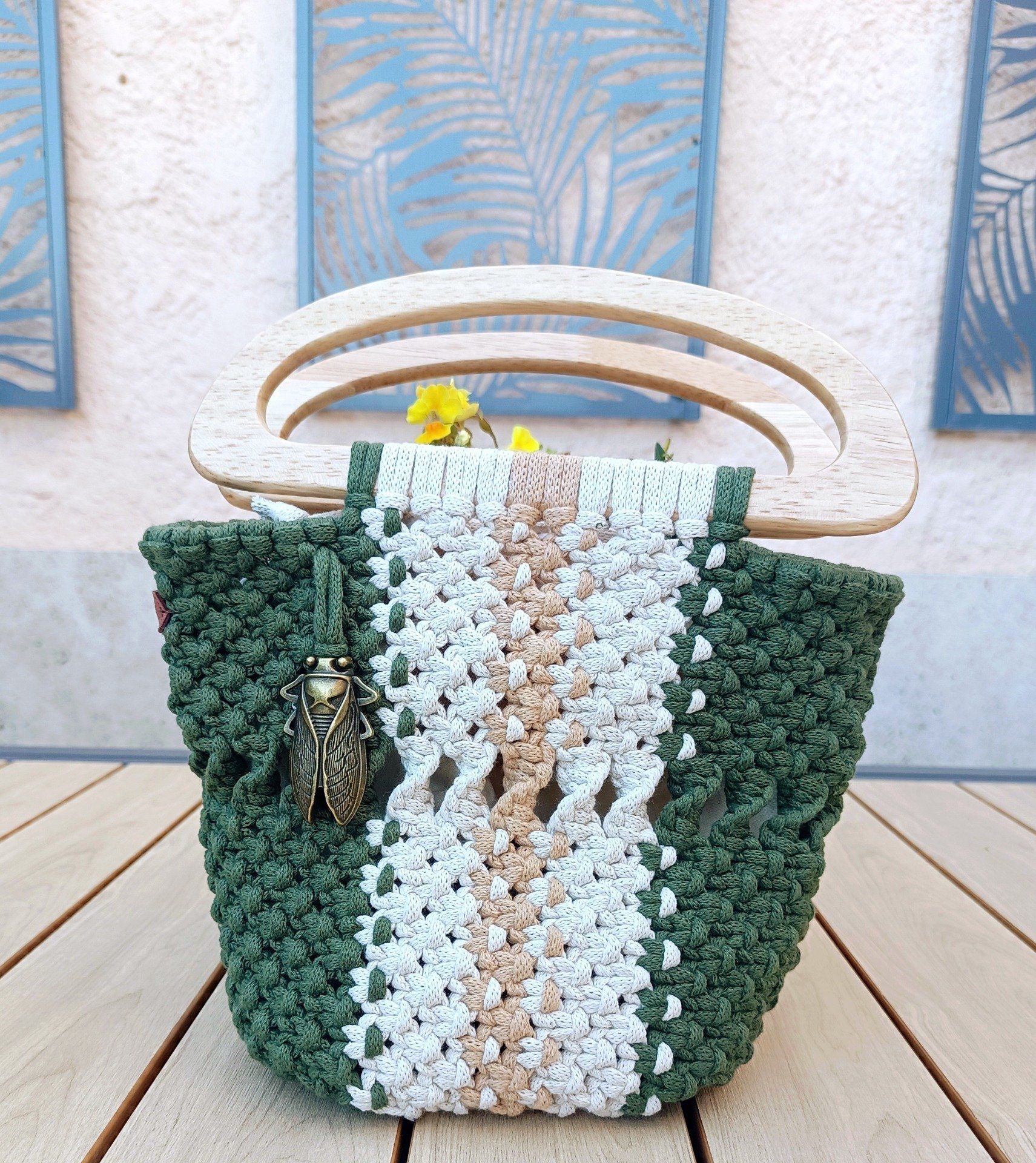 Apportez une touche naturelle et élégante à vos tenues avec ce sac entièrement fait main en macramé. Son jeu de couleurs vert forêt, beige sable et écru lui confère un style bohème chic, parfait pour le quotidien comme pour vos sorties estivales.