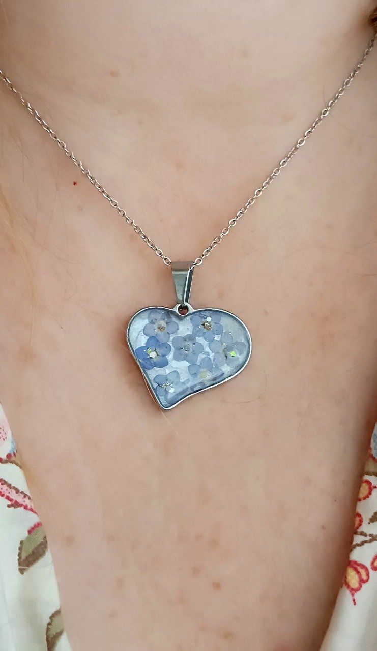 "Le myosotis est l'une de mes fleurs préférées du printemps pour sa simplicité et sa symbolique. J'ai voulu enfermer ces petites touches bleues dans un cœur en acier pour créer un bijou que l'on offre ou que l'on porte comme un talisman affectueux."
