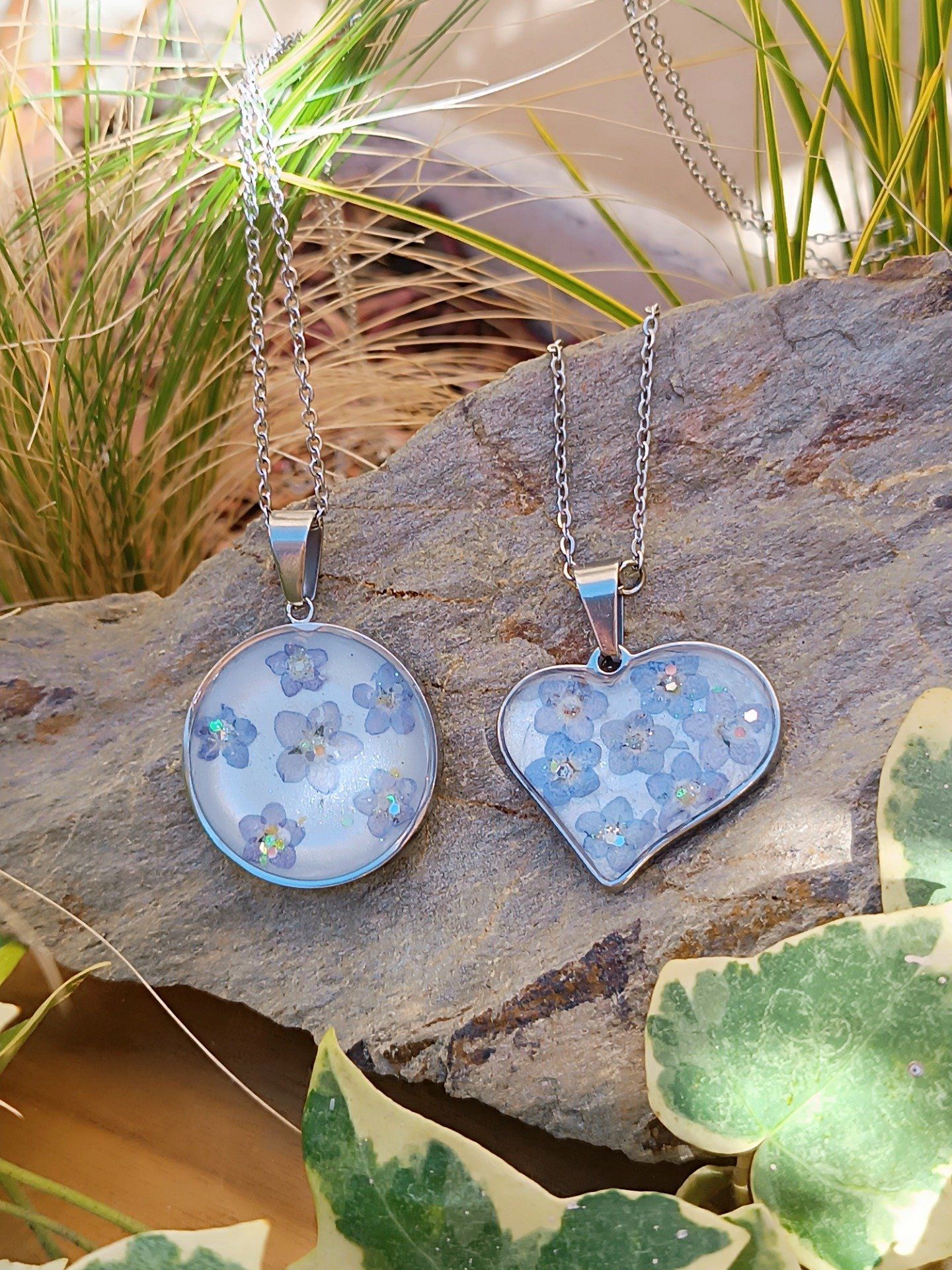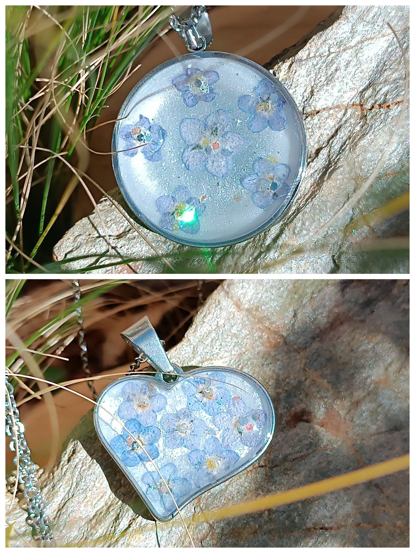 Chaque petite fleur est disposée avec soin dans une résine transparente pour figer sa couleur azur et son centre lumineux, créant des bijoux aussi doux que symboliques.