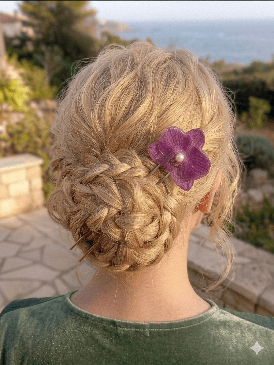 Utilisation : Insérez le pique délicatement dans un chignon, une tresse ou un « coiffé-décoiffé » pour une finition florale instantanée. Pour une tenue impeccable sur cheveux fins, vous pouvez d’abord sécuriser la coiffure avec des épingles invisibles.