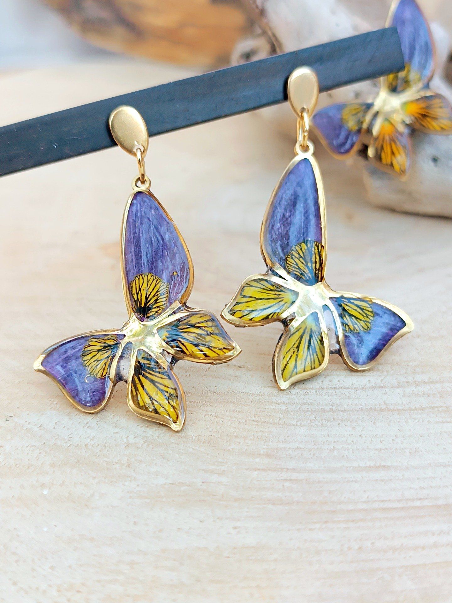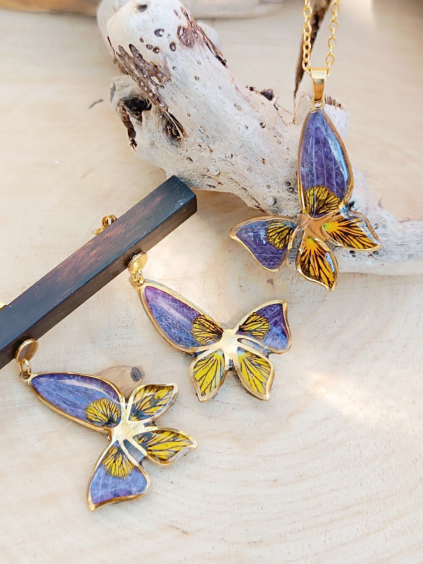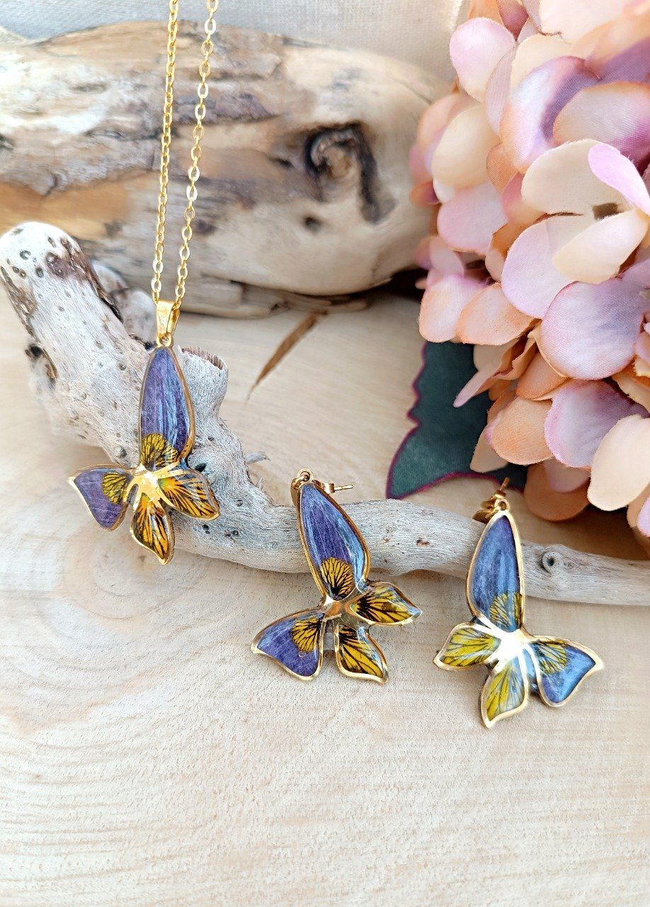Cette parure unique est une prouesse artisanale : chaque papillon est composé de véritables pétales de fleurs assemblés à la main.