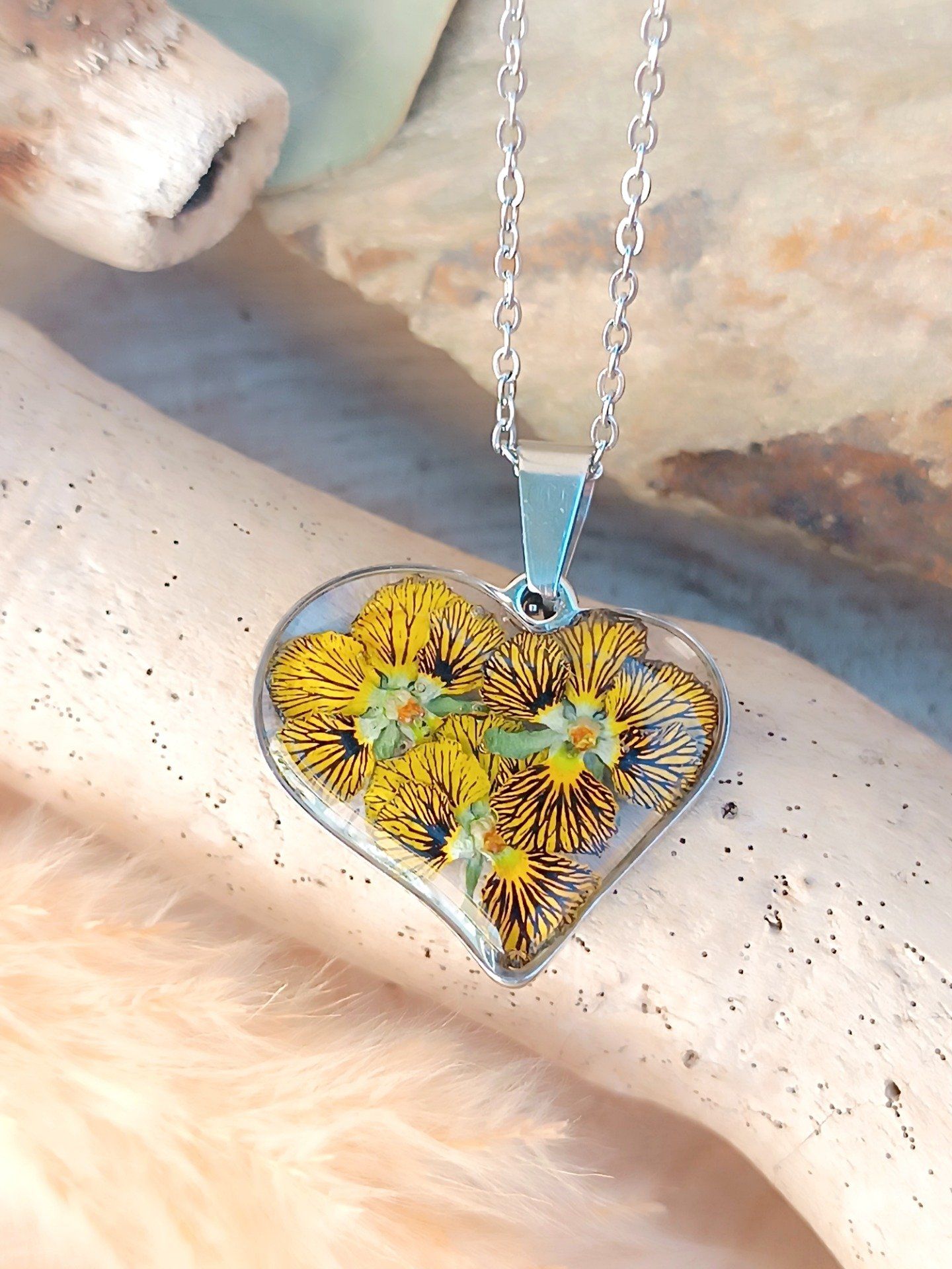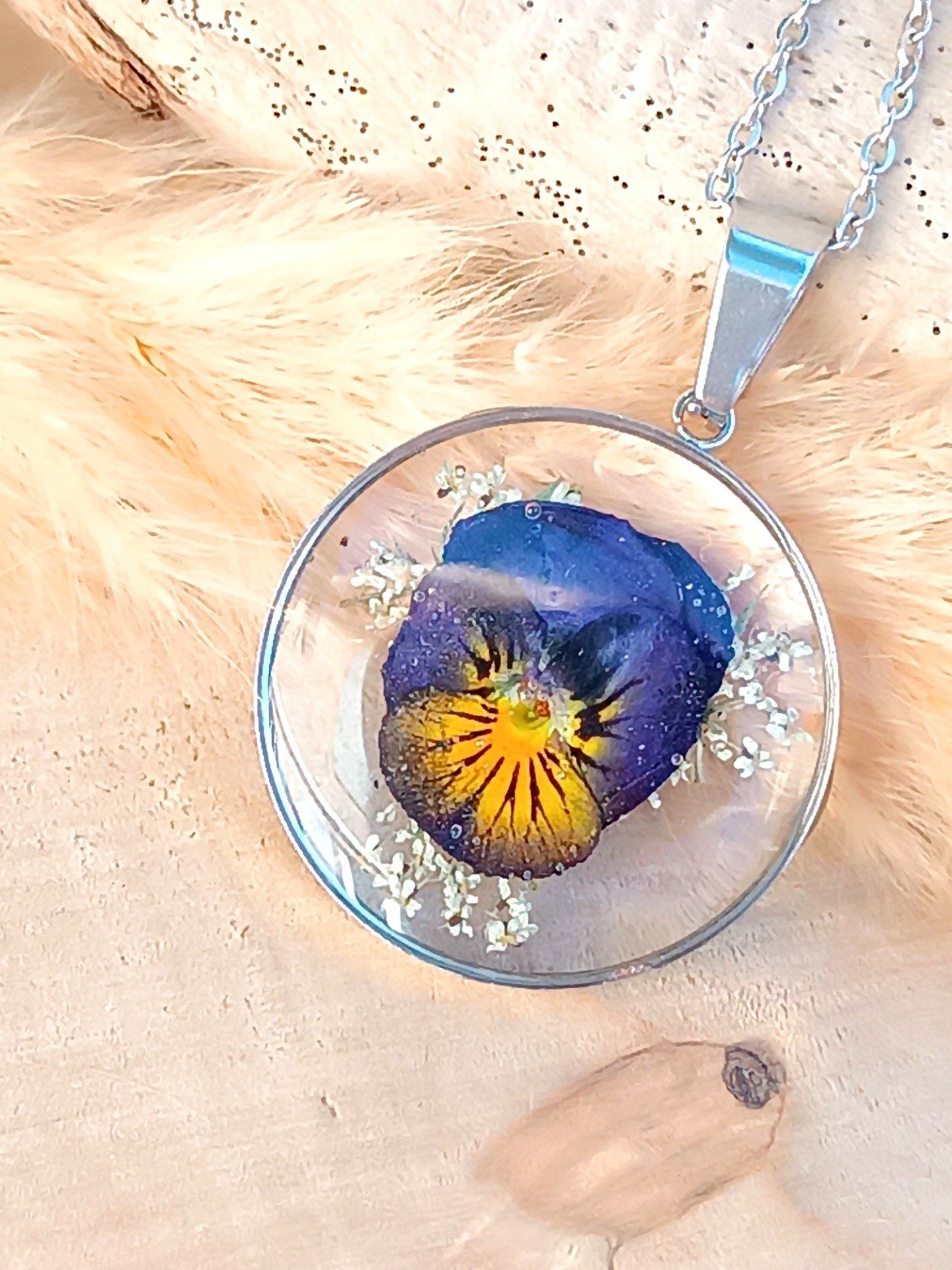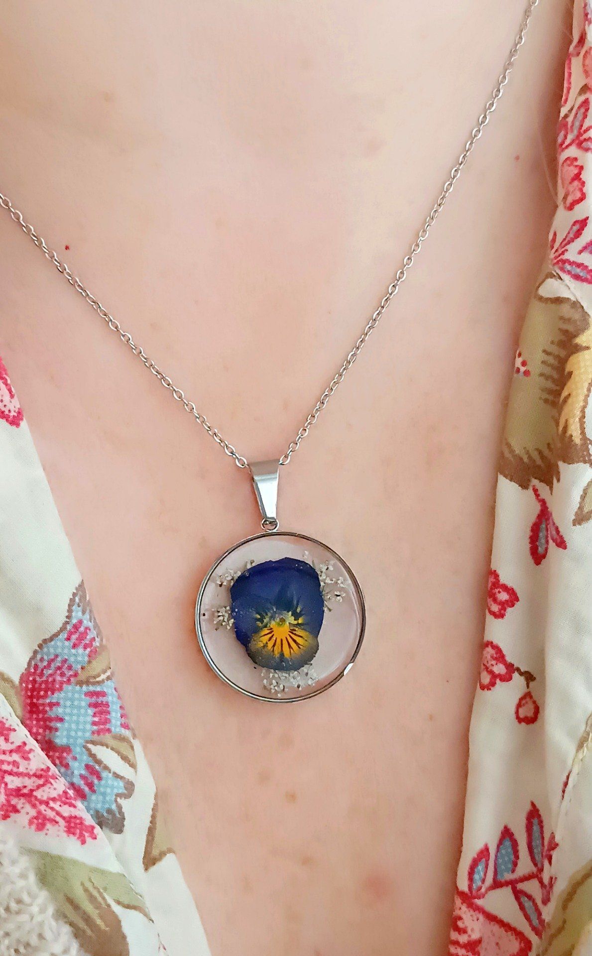Chaque médaillon est un herbier miniature, où la résine cristalline fige la fraîcheur des pétales juste après leur éclosion, pour en préserver l'éclat durablement.