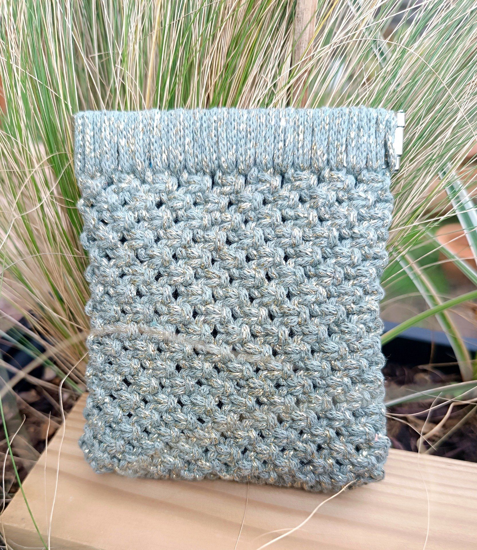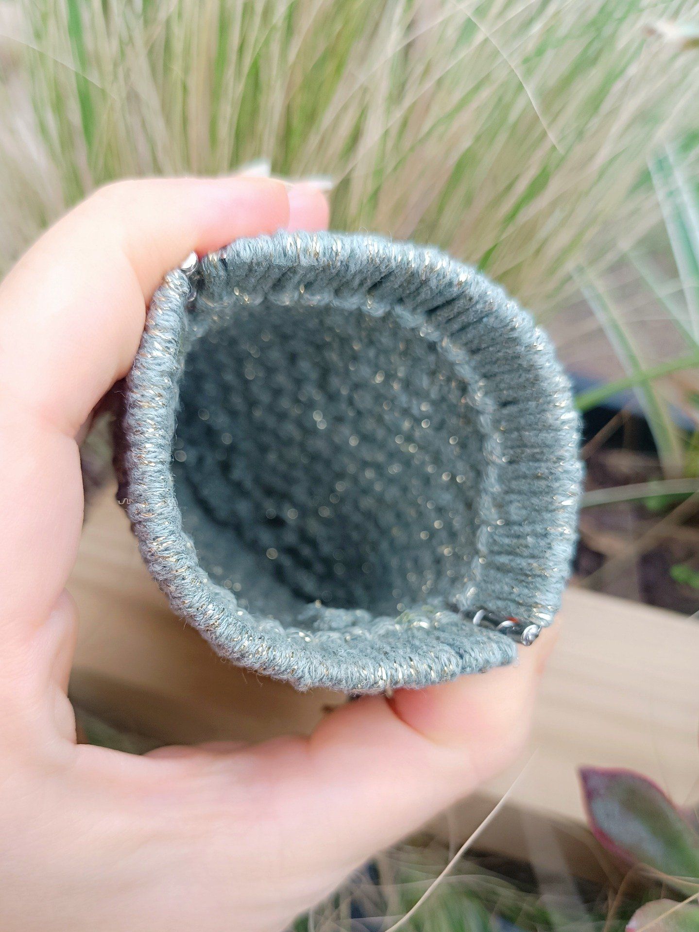 Porte-monnaie en macramé est entièrement réalisée à la main dans un fil de coton rehaussé d’un délicat fil doré.