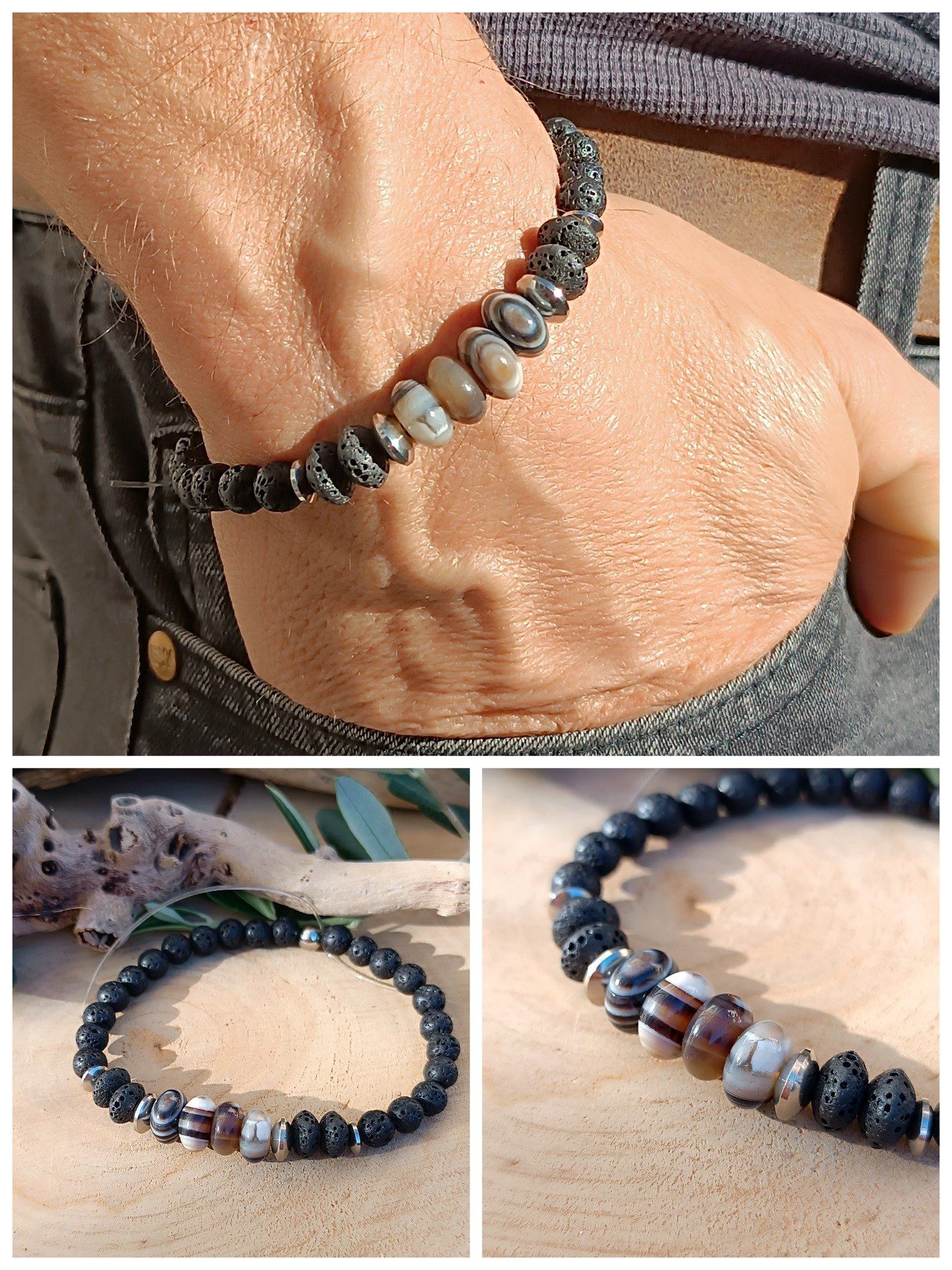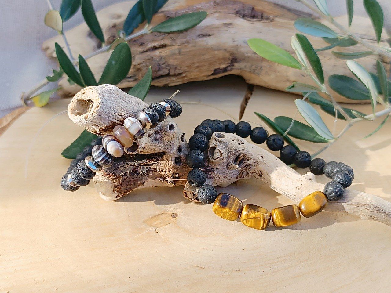 La pierre de lave apporte cette base sombre et organique, tandis que l’œil de tigre joue sur la chaleur et que les agates rubanées ajoutent du détail.
