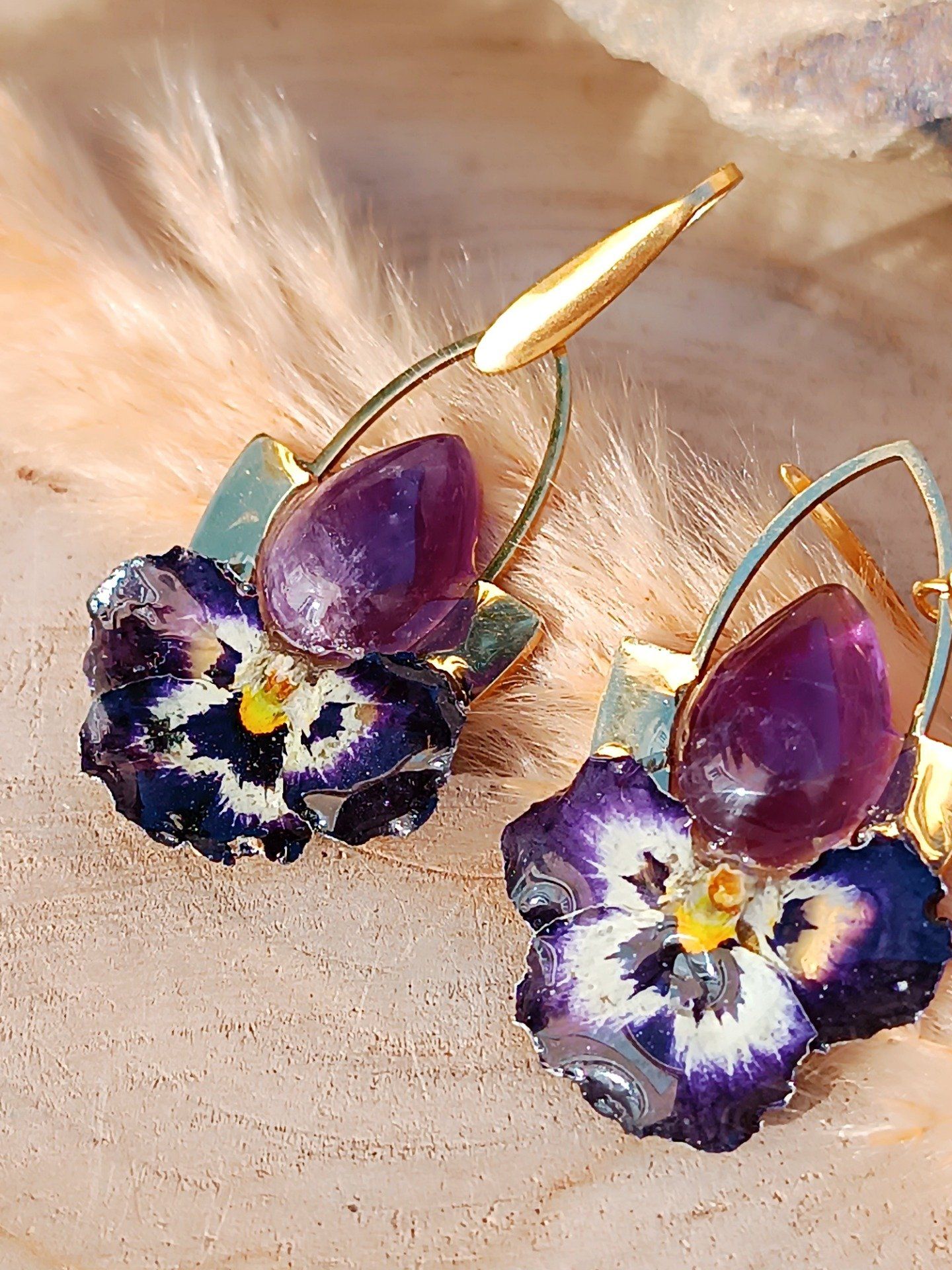 Cette création est née de la rencontre entre une véritable fleur de pensée et l'éclat d'une améthyste naturelle.